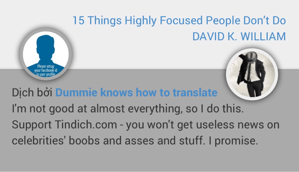 Những người tập trung cao độ không tìm cách trốn việc. Họ biết rằng bạn không thể chờ đợi đến thời điểm và điều kiện thích hợp nhất để làm việc, vì chẳng có thời điểm nào gọi là ‘thích hợp’ cả, mà thông thường, chỉ là bạn tự chờ đến lúc nước tới chân mới nhảy mà thôi. Đừng bảo bạn không có đủ thời gian. Mỗi ngày bạn có đủ 24 giờ đồng hồ như Sir Richard Branson, Mark Zuckerberg và Tổng thống Obama đấy thôi.