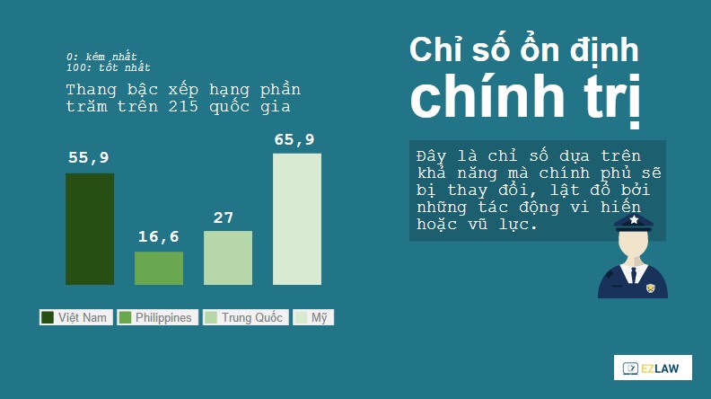 Điểm đáng lưu ý là chỉ số chính phủ dựa thuộc khá nhiều vào tình hình luât pháp của một đất nước. Tại bài này Ezlaw sẽ so sánh 6 chỉ số con của chỉ số chính phủ Việt Nam với 3 nước: Mỹ, Trung Quốc, và Philippines (đất nước trong khu vực Đông Nam Á có GDP tính trên đầu người cao hơn VIệt Nam một bậc).