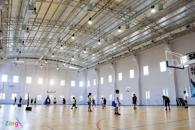 Khu thể thao phức hợp trong nhà với thiết kế đa năng, cho phép học sinh luyện tập nhiều môn như bóng rổ, bóng chuyền, bóng ném, cầu lông.