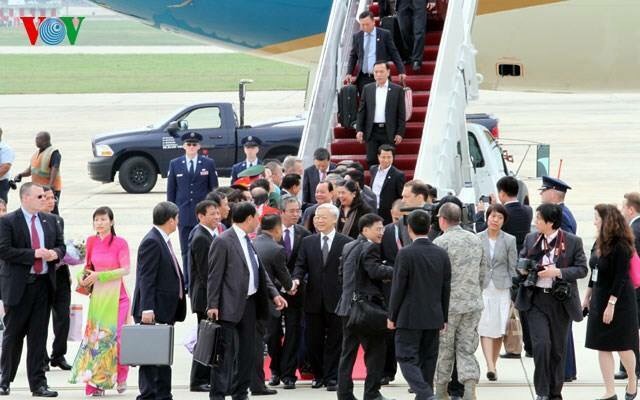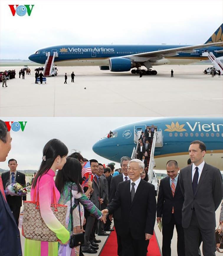Theo đặc phái viên TTXVN, đúng 8 giờ (giờ địa phương, tức 19 giờ Việt Nam) ngày 6/7, Tổng Bí thư Nguyễn Phú Trọng và đoàn đại biểu cấp cao Việt Nam đã đến sân bay quân sự Andrews, ở thủ đô Washington D.C, bắt đầu chuyến thăm chính thức Hợp chúng quốc Hoa Kỳ theo lời mời của Chính phủ Hoa Kỳ.