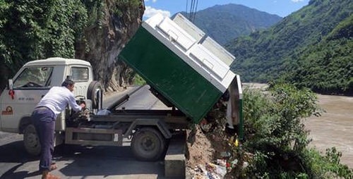 Một xe đổ rác của sở rác thị xã đang đổ rác suống sông Nộ Giang