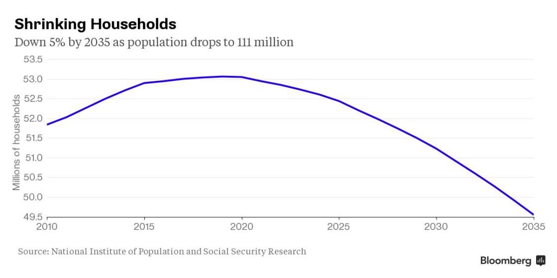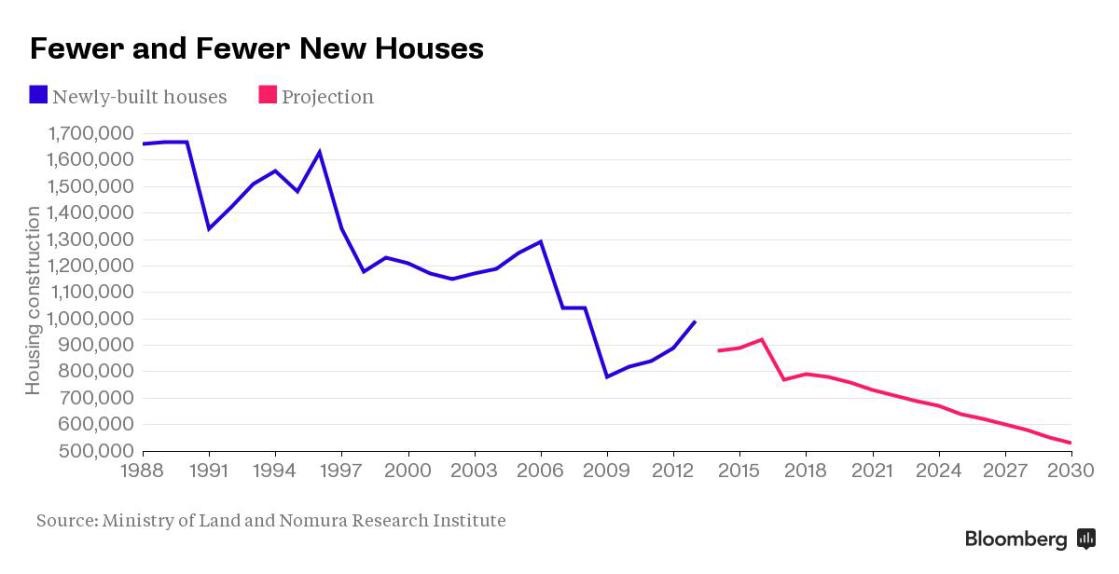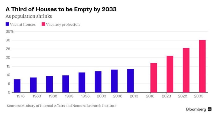 Hiện tại đã có hơn 8 triệu căn nhà bị bỏ trống, và con số đó có thể lên đến 21.5 triệu đến năm 2033, hoặc 1 trong 3 số nhà ở, dựa theo dự đoán của Viện Nghiên Cứu Nomura (Nomura Research Institute).