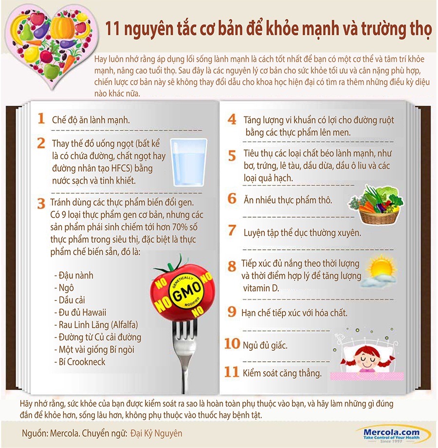 Tôi đã làm infographic (thông tin dạng hình ảnh) này, “11 Hướng dẫn cơ bản để có cuộc sống khỏe mạnh và trường thọ” nhằm tóm tắt tất cả những điều cần thực hiện nếu bạn muốn sống lâu và khỏe mạnh. Thông qua đó bạn sẽ biết được: