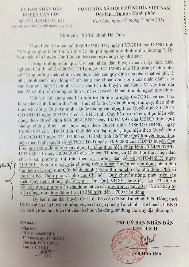 Không trái luật sao được, khi cán bộ ở cả 23 xã của huyện Can Lộc hàng chục năm nay đã lên phương án thu các loại phí ngoài quy định. Riêng năm 2014, tổng số tiền thu lên đến 23.867.662.000 đồng. Mức huy động một xã từ 350 triệu đến 1,7 tỷ đồng. Thú thật, người viết đã phải dụi mắt, đọc lại lần hai con số này vì tưởng mình đọc nhầm- gần 24 tỷ đồng.