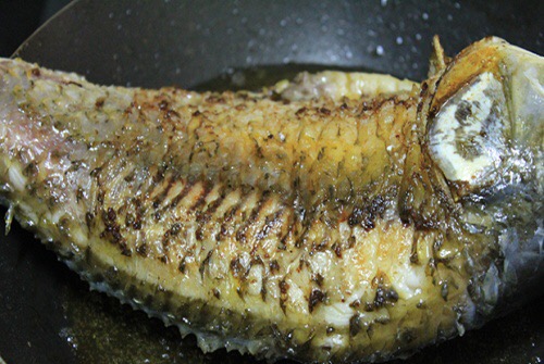 Bước 2: Đánh vảy, làm sạch lòng cá chép với ít muối hạt. Sau đó rửa sạch lại lần nữa, để ráo và đem rán sơ để da cá hơi vàng và thịt cá săn lại.