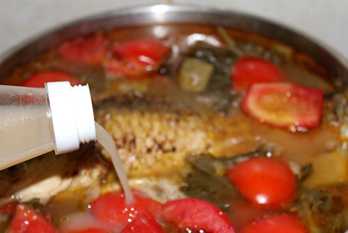 Bước 4: Bắt nồi lên bếp, phi hành thơm và xào phần cà chua để tạo màu đỏ đẹp tự nhiên. Tiếp theo, cho phần dưa chua vào đảo đều với ít gừng và ớt. Cho thêm phần giấm bỗng vào để tăng thêm hương vị cho món ăn trước khi cho cá vào và chêm thêm nước.