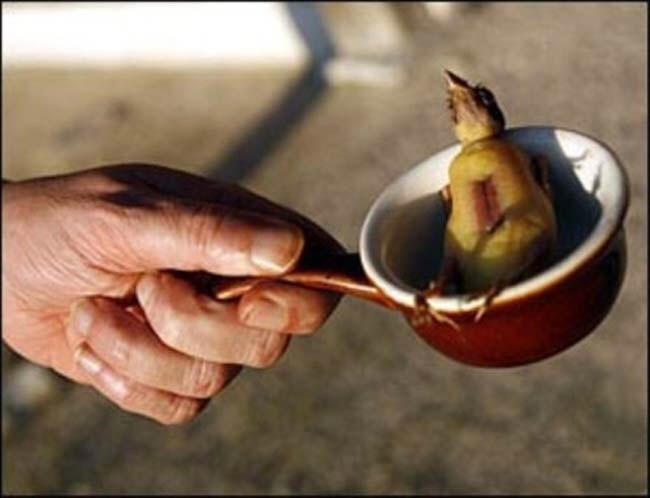 Ortolan (Pháp). Đây là một món ăn có nguồn gốc từ Pháp. Đầu tiên người ta bắt chim sẻ rừng, làm cho con chim mù đi bằng cách kẹp mắt nó lại và nhốt vào một chiếc lồng thật chật sao cho nó không thể nhúc nhích được. Sau đó, chỉ cho con chim ăn những thức ăn như hạt kê, nho khô và quả sung cho đến khi nào con vật dài được khoảng từ 2 lần đến 4 lần kích thước bình thường thì đem nhúng nó vào trong rượu Armagnac. Đem nướng con chim đó chừng 6 đến 8 phút là có thể ăn được. Cách ăn món chim này cũng cực kì độc đáo, người ta đặt con vật vào miệng sao cho đầu con vật hướng ra bên ngoài và nhai nó một cách từ từ để cảm nhận được hương vị của món ăn.