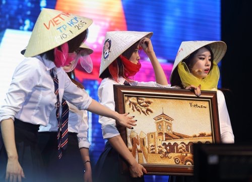 Nhóm nhạc T-ara Hàn Quốc đội nón lá trong một buổi biểu diễn tại Việt Nam. Ảnh: VnExpress