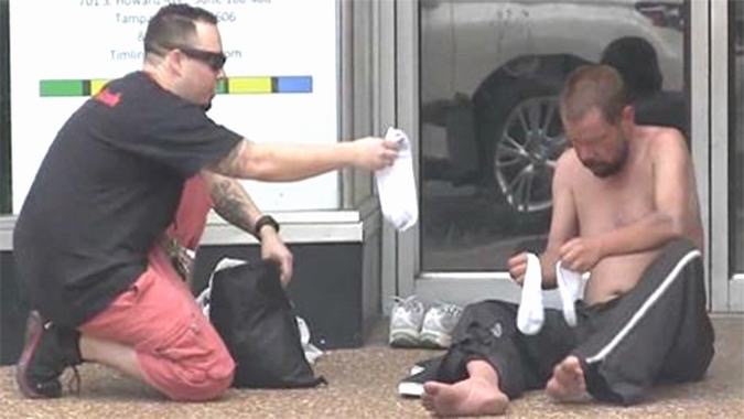 Người đàn ông đang tặng tất cho một người vô gia cư.