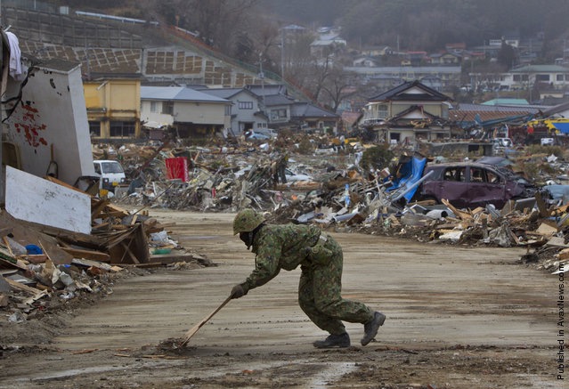 Một quân nhân Nhật đang làm thông thoáng đường để xe cần cẩu và xe ủi đất có thể chạy vào ngày 20/3/2011 tại Ofunato Nhật Bản (Ảnh: Paula Bronstein /Getty Images)