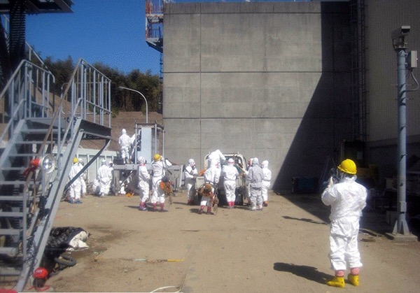 Bức ảnh này được chụp vào ngày 18/3/2011 và được công bố vào thứ Tư ngày 23/3/2011 bởi công ty Điện lực Tokyo. Công nhân trong những bộ đồ bảo hộ chuẩn bị kết nối đường truyền để khôi phục lại nguồn điện tại nhà máy Fukushima đã bị tê liệt do thảm họa sóng thần.