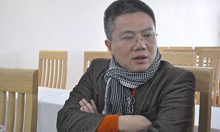 GS Ngô Bảo Châu trao đổi với các phóng viên báo Tiền Phong, Dân Trí, VietNamNet, Infonet. (Ảnh: Văn Chung).