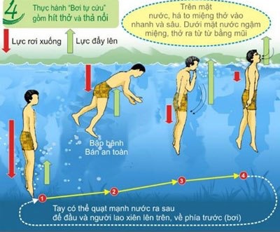 Bạn nên trang bị tốt những kiến thức để sống sót khi bị chìm, để nhỡ không may trong lúc cứu người, bạn gặp sự cố mà chìm xuống thì vẫn còn cách để thoát nạn. Khi mới chìm xuống, ngay lập tức hãy bịt mũi, nhắm mắt nín thở để người nổi lên cho khỏi bị tràn nước vào phổi. Sau đó, dùng tay hoặc chân làm mái chèo, quạt nước đẩy đầu nhô khỏi mặt nước hoặc cũng có thể quạt nước xiên, đẩy người bơi đi dễ dàng bởi trong nước người trở nên nhẹ hơn so với trên cạn.