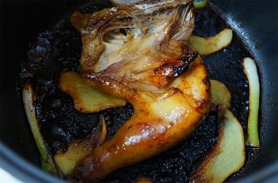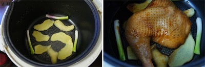 Đặt gừng và một ít hành lá ở dưới đáy nồi, sau đó cho gà và nước ướp vào.