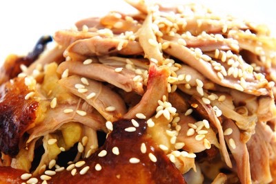 Sau khi nồi chuyển qua chế độ hấp lần nữa, thì bạn cho phần hành lá còn lại vào, bật nút nấu và đợi đến khi nồi chuyển hấp là gà đã chín.Trước khi dùng, bạn xé gà ra nhiều miếng nhỏ rồi rắc mè rang vào và chừa lại phần nước xốt trong nồi ăn kèm ít rau xanh cũng rất ngon.