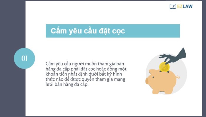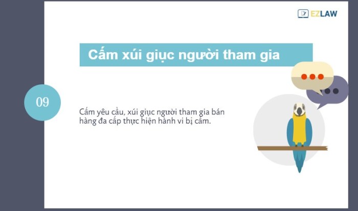 Tuy bị cấm ở nhiều nước trên thế giới (như Trung Quốc), nhưng bán hàng đa cấp vẫn được cho phép tại Việt Nam. Tuy vậy, chính phủ cũng đã quy định rất chi tiết các hành vi bị cấm khi kinh doanh đa cấp. Để tránh bị các doanh nghiệp kinh doanh đa cấp bất chính lợi dụng và lừa đảo, mọi người nên biết 9 điều cấm mà các doanh nghiệp cùng người bán hàng đa cấp không được thực hiện tại Việt Nam. (xem thêm tại Nghị định 42/2014)
