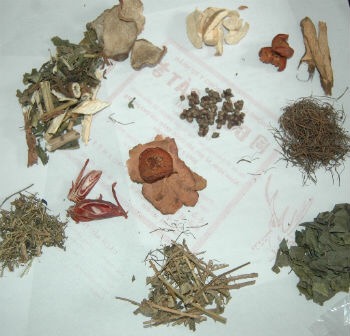 Cam thảo đất, táo mèo, vỏ bưởi, hạt chuối sứ, củ ráy tía, củ sơn thục, củ khúc khắc, lá lốt, dây tơ hồng, cà gai leo, củ tỏi đỏ và cây bồ công anh.