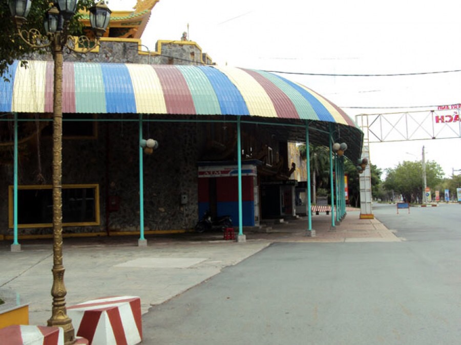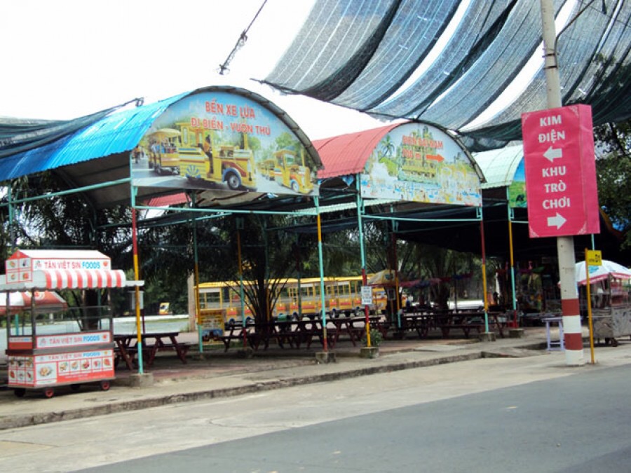 Sạp sắt phủ bạt ở khu du lịch tàu điện cho khách du lịch đứng tránh nắng.