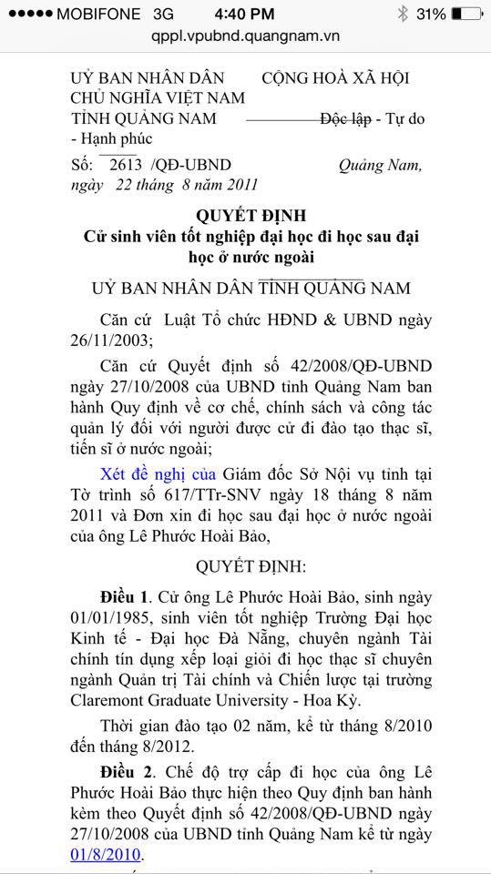 Trong quá trình lọ mọ tìm hiểu về “thần đồng chính trị”, mềnh đã vớ được cái quyết định rất quí này từ trang cơ sở dữ liệu văn bản qui phạm pháp luật của văn phòng UBND tỉnh Quảng Nam (http://qppl.vpubnd.quangnam.vn/…/E9C0C62E2…/$file/qd2613.doc) và đã hiểu ra…Fugacar: Quyết định cử sinh viên tốt nghiệp đại học đi học sau đại học do ông Nguyễn Ngọc Quang- Phó chủ tịch UBND tỉnh Quảng Nam kí ngày 22/8/2011, nhưng trong Điều 1 lại ghi rõ “Thời gian đào tạo 2 năm, từ tháng 8/2010 đến 8/2012”. Như vậy, có nghĩa là đồng chí Bảo đi học đã được 1 năm rồi mới có quyết định…cử đi học và được hưởng trợ cấp của tỉnh.