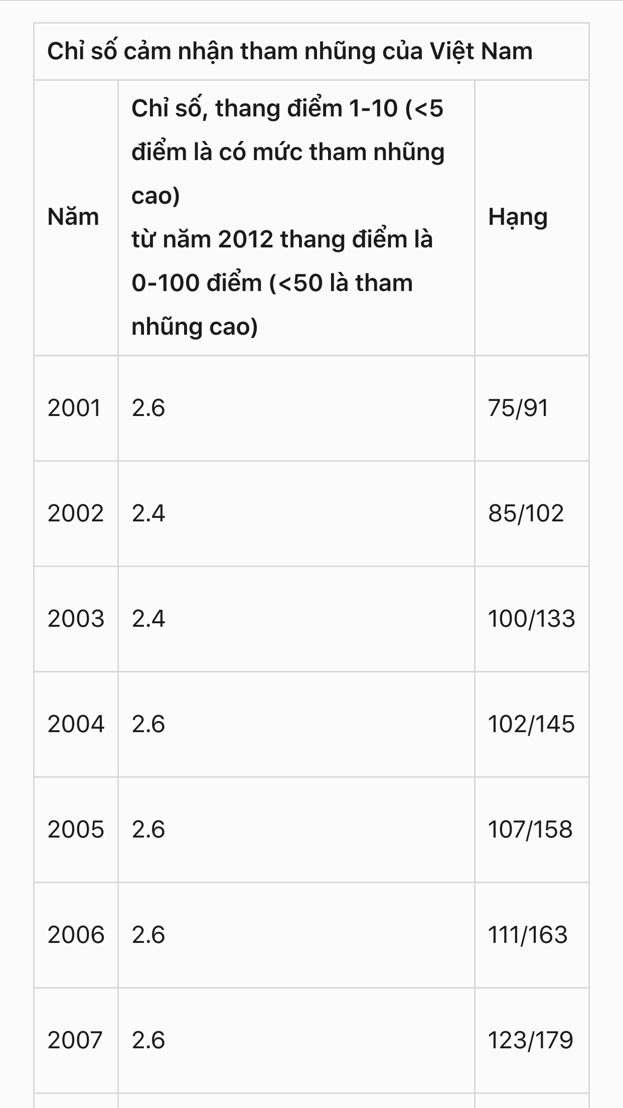 Nhìn vào chỉ số cảm nhận tham nhũng của Việt Nam thật đáng e ngại, các chỉ số dưới 5 (với thang điểm 10), hay 50 (với thang điểm 100) là ở mức tham nhũng cao, nhưng Việt Nam còn ở dưới rất xa các mốc này.
