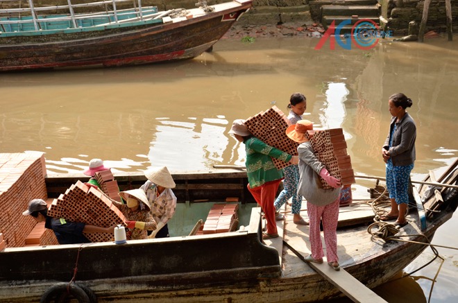 Còn với Trần Thị Quỳnh Như (tổ 23, ấp Hòa Phú 2, thị trấn An Châu), với mỗi “trụ” gạch (gồm 300 viên gạch ống) cõng xong xuống ghe, em được trả công 3.500 đồng, theo giá làm công năm 2010. (Tin, ảnh: baoangiang.com.vn)