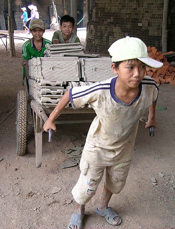 Ba đứa trẻ cùng kéo một xe ngói vào lò nung ở một lò gạch tại thị trấn An Châu, huyện Châu Thành (An Giang). (Tin, ảnh: nld.com.vn)
