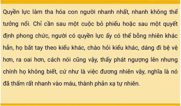 Quyền lực làm tha hóa con người nhanh nhất, nhanh không thể tưởng nổi. Chỉ cần sau một cuộc bỏ phiếu hoặc sau một quyết định phong chức, người có quyền lực ấy có thể bỗng nhiên khác hẳn, họ bắt tay theo kiểu khác, chào hỏi kiểu khác, dáng đi bệ vệ hơn, ra oai hơn, cách nói cũng vậy, thấy phát ngượng lên nhưng chính họ không biết, cứ như là việc đương nhiên vậy, nghĩa là nó đã thấm rất nhanh vào máu, thành phản xạ tự nhiên.