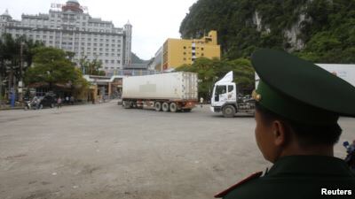 Nhân viên hải quan Việt Nam giám sát xe tải băng qua cửa khẩu Tân Thanh với Trung Quốc ở tỉnh Lạng Sơn, ngày 30/7/2014.