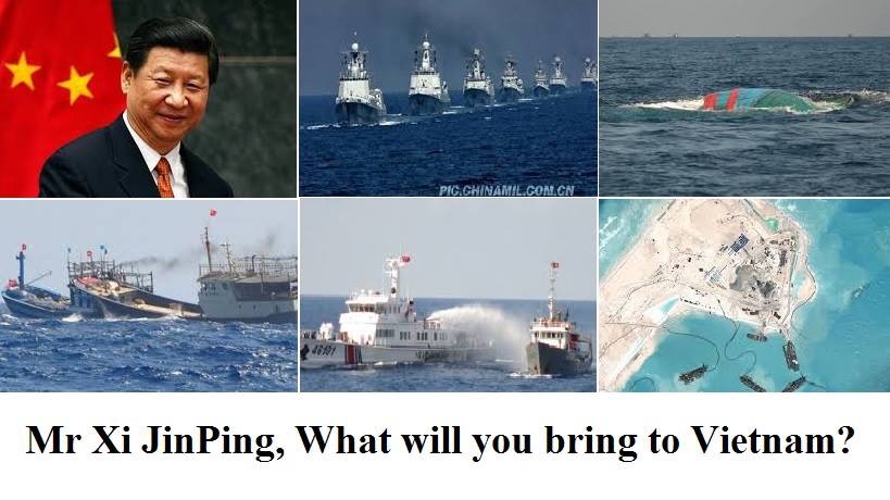 Tập Cận Bình sẽ trả lại Hoàng Sa chăng? Hay ông ta sẽ trả nốt cả Trường Sa, những thứ mà lính Trung Quốc đã tấn công Việt Nam để đoạt lấy? Đảng Cộng Sản Việt Nam và chính phủ Việt Nam, theo nguyên tắc ngoại giao, các ông đang đón tiếp Tập Cận Bình và cần phải làm thế, nhưng có một câu hỏi mà các ông buộc phải trả lời: Chính các ông, những người đã để mất lãnh thổ khi mình đang cai trị, các ông đang làm gì để gìn giữ đất nước?