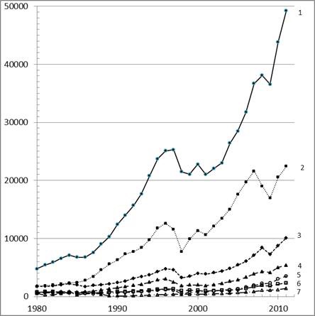 Biểu đồ 1. Biến đổi chỉ số GDP đầu người (US$) của Singapore (1), Nam Hàn (2), Malaysia (3), Thái Lan (4), Indonesia (5), Philippines (6) và Việt Nam (7) qua thời gian 31 năm kể từ 1980 đến 2011.