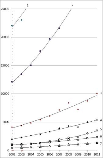 Biểu đồ 2. Đường biểu diễn biến đổi chỉ số GDP đầu người (US$) của Singapore (1), Nam Hàn (2), Malaysia (3), Thái Lan (4), Indonesia (5), Philippines (6) và Việt Nam (7) qua thời gian 10 năm từ 2002 đến 2011. Đường biểu diễn do chương trình toán học thống kê cho kết quả phù hợp với các số dữ kiện với độ chính xác rất cao (R2 từ 0.944 cho Malaysia và 0.988 cho Việt Nam).