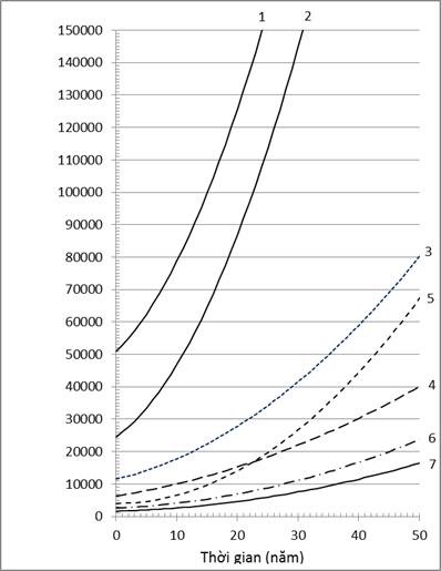 Biểu đồ 3. Đường biểu diễn tiên đoán GDP đầu người trong thời gian 50 năm tới (trục tâm 0 là năm 2013) cho Singapore (1), Nam Hàn (2), Malaysia (3), Thái Lan (4), Indonesia (5), Philippines (6) và Việt Nam (7). Tiên đoán dựa theo vận tốc tăng trưởng của thời gian 2002-2011 của biểu đồ 2.