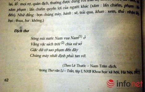 Nếu trước đây, bài thơ: “Sông Núi Nước Nam” được dịch là: “Sông núi nước Nam vua Nam ở/Rành rành định phận tại sách trời/ Cớ sao lũ giặc sang xâm phạm/ Chúng bay sẽ bị đánh tơi bời”, thì nay ở trang 62 sách Ngữ văn lớp 7 tập I, Nhà xuất bản Giáo dục Việt Nam (NXBGDVN) phát hành lại dịch như sau: “Sông núi nước Nam vua Nam ở/ Vằng vặc sách trời chia xứ sở/ Giặc dữ cớ sao phạm đến đây/ Chúng mày nhất định phải tan vỡ”.