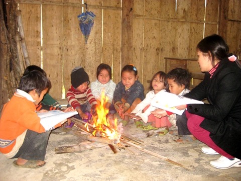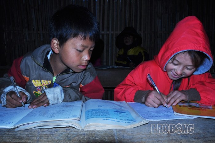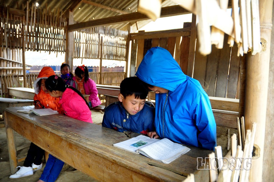 Các em học sinh đang đọc chữ, ở những khe cửa này, mùa đông gió lùa vào rất lạnh. (Ảnh: laodong.com.vn)