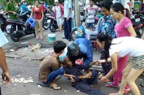 Một cụ bà 70 tuổi gầy gò ngất xỉu sau khi xe bán trái cây rong là nguồn sống của cụ bị công an phường thu giữ. Một số người dân thấy cảnh đau lòng xúm lại bế cụ đi cấp cứu. – (Ảnh: Facebook)