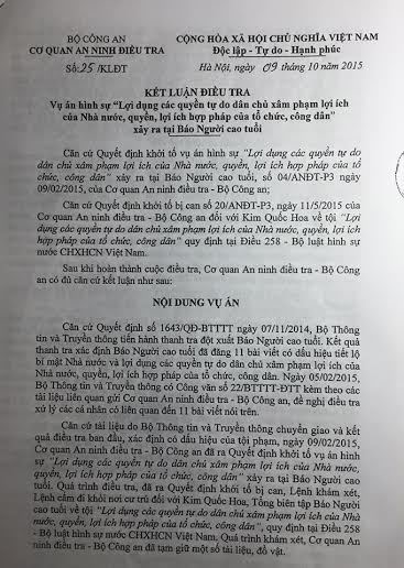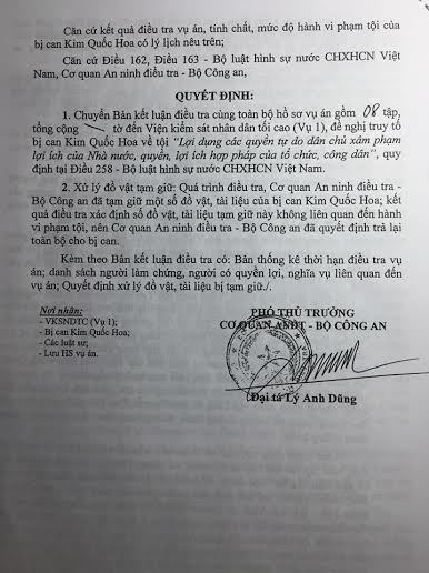 TTXVH: Chúng tôi nhận được bản kết luận điều tra từ ông Nguyễn Quốc Dũng, con trai ông Kim Quốc Hoa, TBT báo Người Cao Tuổi. Cơ quan an ninh điều tra đã gửi kết luận điều tra này tới VKS NDTC (Vụ 1), đề nghị truy tố ông Kim Quốc Hoa theo điều 258: “Chuyển bản kết luận điều tra cùng toàn bộ hồ sơ vụ án gồm 08 tập, tổng cộng… tờ đến Viện Kiểm sát NDTC (Vụ 1), đề nghị truy tố bị can Kim Quốc Hoa về tội ‘Lợi dụng các quyền tự do dân chủ xâm phạm lợi ích của Nhà nước, quyền, lợi ích hợp pháp của tổ chức, công dân’, quy định tại điều 258 – Bộ luật hình sự nước CHXHCN Việt Nam”. Mời quý độc giả đọc thêm: