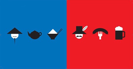 Đông Tây trong mắt nhau: Trong mắt người phương Tây, người phương Đông đặc trưng với nón lá, thích uống trà và ăn cơm. Người phương Đông ấn tượng với người phương Tây vì mũ nồi cao, xúc xích và bia.