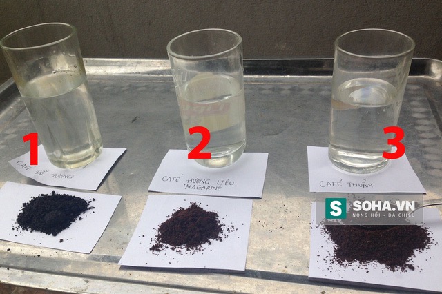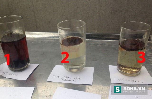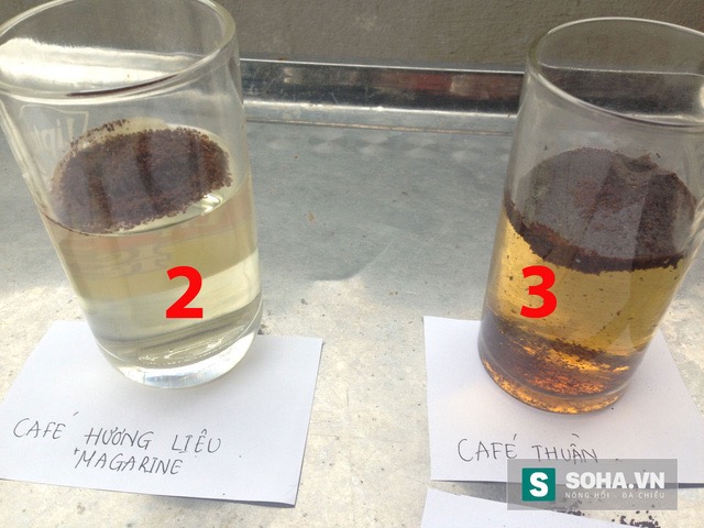 -Ly số 1 chứa cà phê làm từ ngô, đậu tương rang cháy khét: chìm nhanh nhất. Có thể thấy bột cà phê rơi “lả tả” như “sung rụng”.