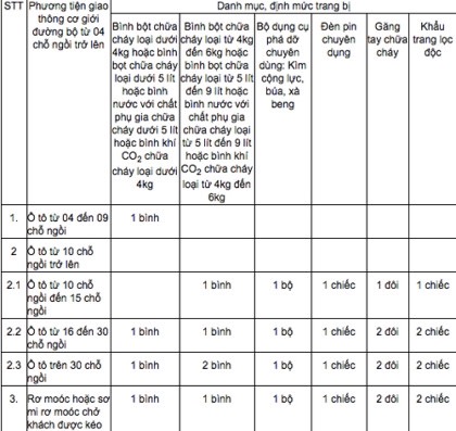 Số găng tay chữa cháy và khẩu trang lọc độc được yêu cầu gấp đôi đối với ô tô từ 16 chỗ ngồi trở lên.