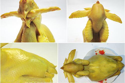 Gà chầu: Gà sau khi mổ moi, lấy dao rạch cổ gà ra hơi to một chút, nhét hai cánh gà vào trong cổ, để phần đầu cánh thò một chút ra ngoài miệng gà.