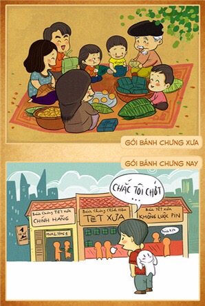 Mới đây vào những ngày giáp Tết, bộ tranh so sánh giữa Tết xưa và Tết nay đã gây được sự chú ý lớn nhờ vào những hình ảnh được vẽ theo phong cách hoạt hình rất ngộ nghĩnh. Nhiều bạn trẻ thời 9x hay sinh vào những năm 2000 sẽ khó có thể biết được Tết xưa và Tết nay khác nhau như thế nào. Xem bộ tranh này xong có thể các bạn sẽ biết thêm được nhiều điều về văn hóa cổ truyền ngày Tết. Nhưng từ những nội dung so sánh ấy cũng khiến người xem phải suy ngẫm về những giá trị văn hóa đang dần bị mai một.