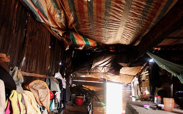Sống phân nửa đời người, gia đình anh Hải vẫn chưa có nổi khoảnh đất để dựng tạm túp lều. Căn nhà anh đang ở do 1 người dân cho ở tạm vì quá thương cho hoàn cảnh của 3 cha con. Túp lều rách nát, vá chằng chịt vải bạt, bao bố để ngăn những trận mưa, những hồi gió lạnh hắt vào 3 người khốn khổ ấy. Trong căn nhà ấy, chiếc ghế bọc da nham nhở chỗ có chỗ không, chiếc bàn nhựa đã gãy, chỉ có mấy cái nồi nhôm méo mó bám đầy nhọ đen kịt là thứ giá trị nhất. Không điện sáng, không nước sạch, không có nổi một chiếc xe đạp cà tàng! Những ngày mưa gió rét buốt, ba cha con anh chỉ biết ôm ấp nhau trốn cái đói cái lạnh trong chiếc giường đã mục được che tấm bạt rách tươm!