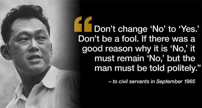 “Đừng đổi ‘Không’ thành ‘có’. Đừng là một thằng hề. Nếu có lý do chính đáng giải thích tại sao lại là ‘Không’ thì phải giữ câu trả lời ‘Không’, nhưng sự từ chối phải được nói ra một cách lịch lãm”, trích từ bài nói chuyện của ông Lý với các công chức vào tháng 9/1965. Ảnh: CNN