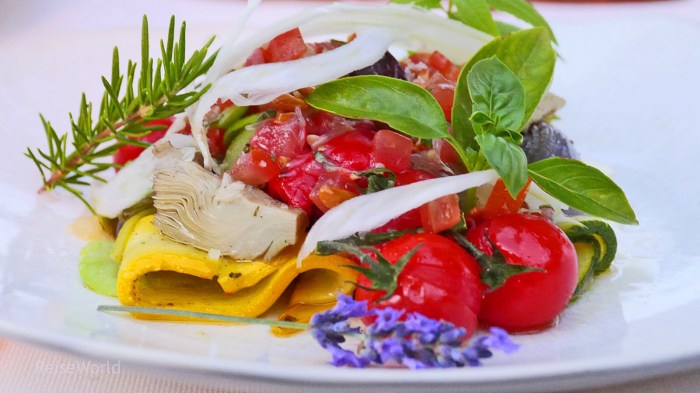 Ảnh hưởng từ nền ẩm thực Pháp, những món ăn ở Provence không chỉ ngon miệng mà còn ngon mắt. Trong ảnh là món khai vị kết hợp giữa thịt hun khói và dưa vàng.