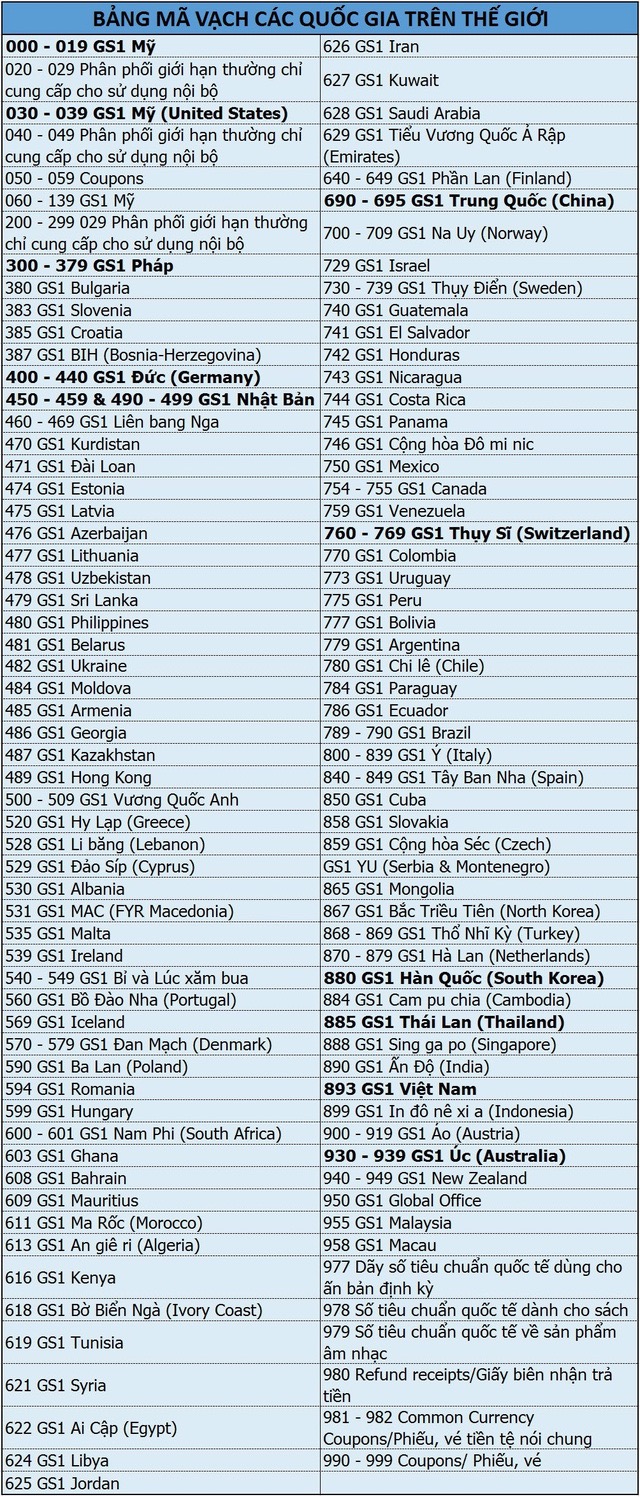 Trên đây là ký hiệu mã số mã vạch hàng hóa các nước, để biết hàng hóa sản xuất tại nước nào như các quốc gia sản xuất: điện thoại như iphone, đồ điện tử, điện máy, thuốc dược phẩm, mỹ phẩm, thực phẩm, thời trang, nội thất, đồ chơi, hàng tiêu dùng… hàng hóa xuất khẩu, nhập khẩu. Các bạn tham khảo để tránh mua phải hàng giả nhé !