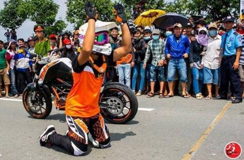 Một vận động viên Malaysia vái lại khán giả Việt Nam vì tràn vào đường đua gây cản trở giải đấu.