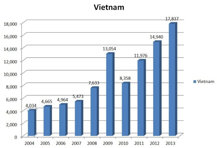 Lượng tiền chuyển phi pháp từ Việt Nam ra nước ngoài tăng gần 4 lần trong giai đoạn 2004-2013. (Đồ họa: Vntinnhanh dựa trên số liệu từ GFI)