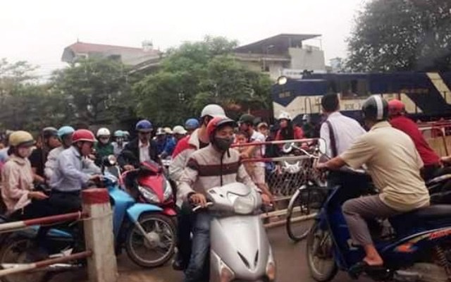 Dù nhân viên đường sắt đã kéo barie, hàng chục người đi xe máy vẫn bất chấp tăng tốc băng qua đường sắt ngay trước mũi tàu hỏa khiến tàu hỏa phải dừng khẩn cấp để tránh gây nên một thảm họa ngành đường sắt.