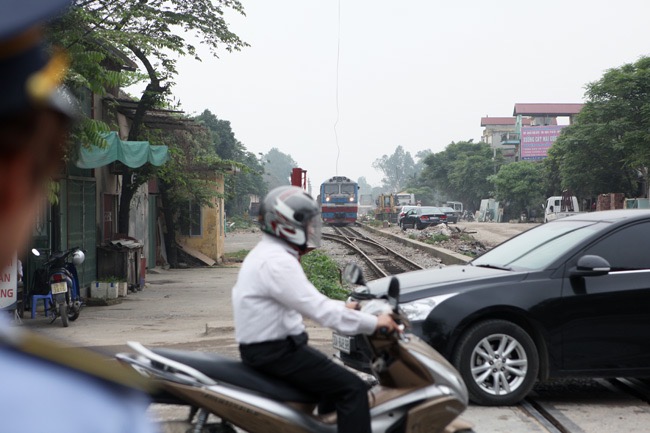 Ô tô, xe máy đều ung dung vượt rào chắn ngay ngày hôm sau, 14/4, dù tàu đã gần tới nơi. (Ảnh: danviet.vn)