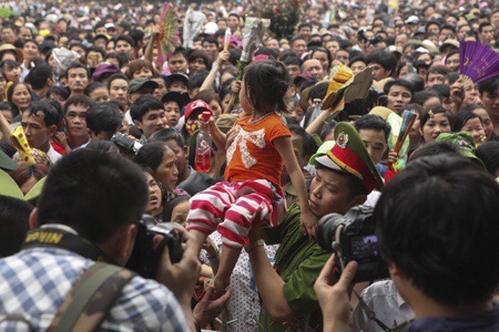 Biển người’ chen lấn tại lễ hội Đền Hùng, ngày 16/4/2016. Nhiều trẻ nhỏ sợ hãi bật khóc, được công kênh lên cao để đưa ra khỏi vùng nguy hiểm. (Ảnh: laodong.com.vn)